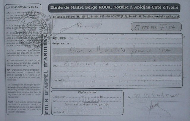 Reçu du paiement des honoraires |