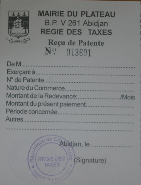 Reçu de paiement de la Taxe forfaitaires des petits commerçants et artisans |