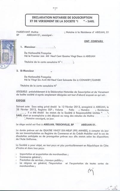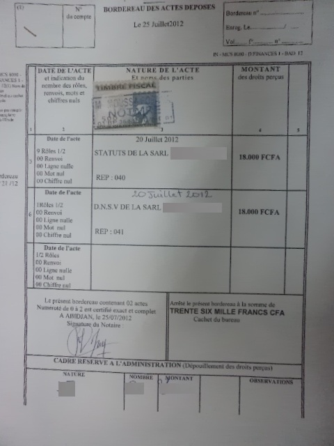 pour les honoraires du notaire - forfait uniquement pour une SARL au capital de 1 000 000 F CFA TVA incluse