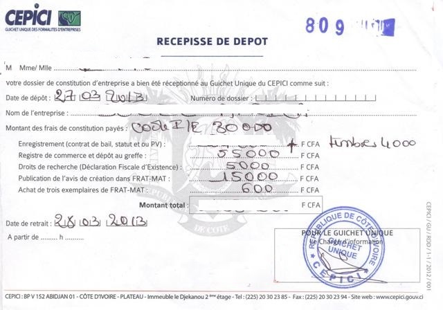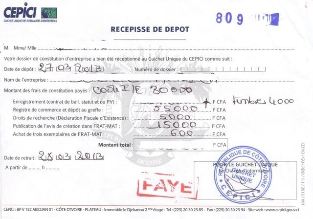 pour les frais de publication de l'avis de création à Fraternité Matin